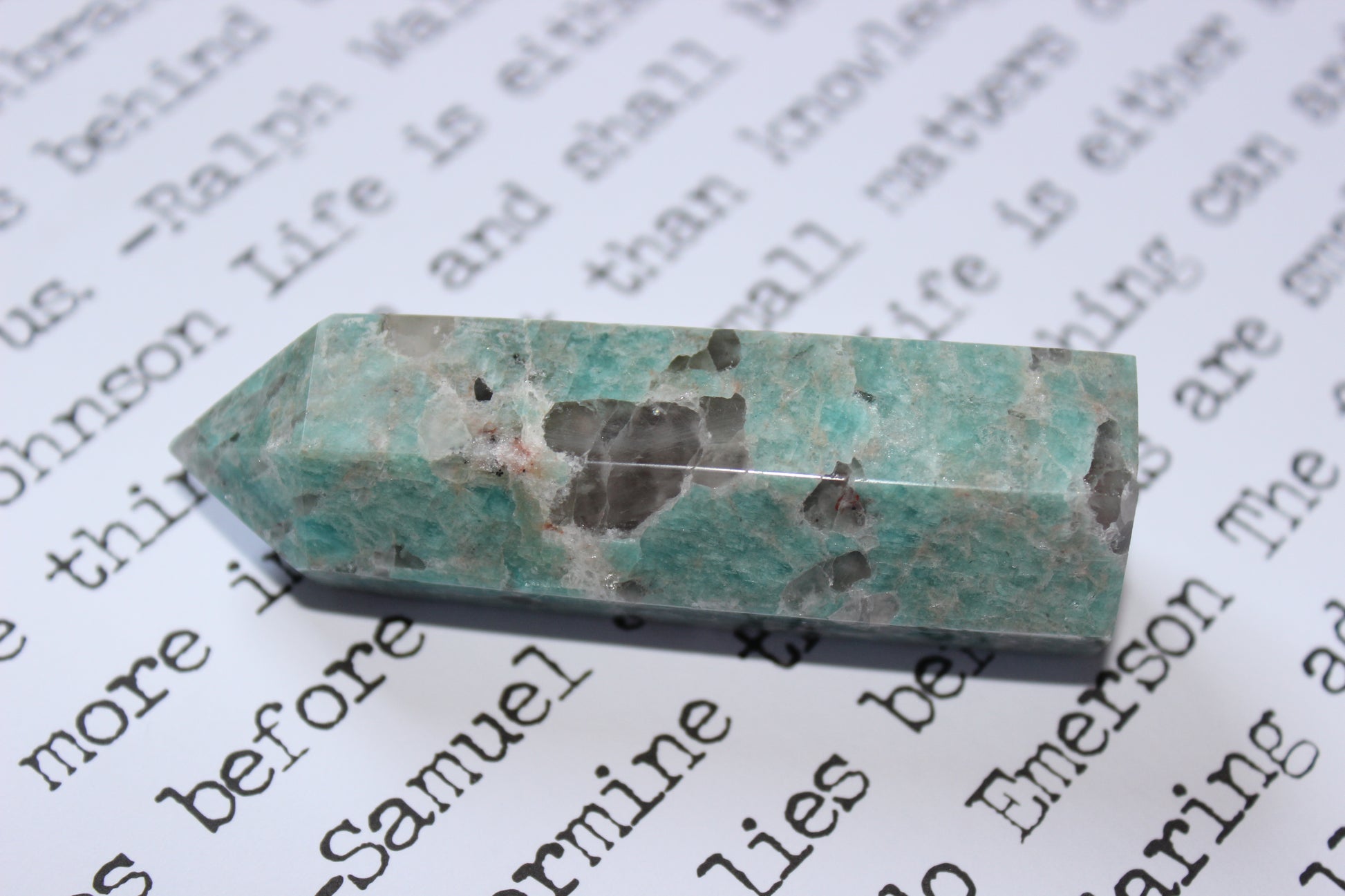 Cool as rain-washed vellum and streaked with aqua declarations, this Amazonite tower holds the tone of ancient prayers sung beneath open skies. Its sea-green hues ripple like quill strokes across parchment, each band a testament to clarity forged in softness, strength phrased in serenity.