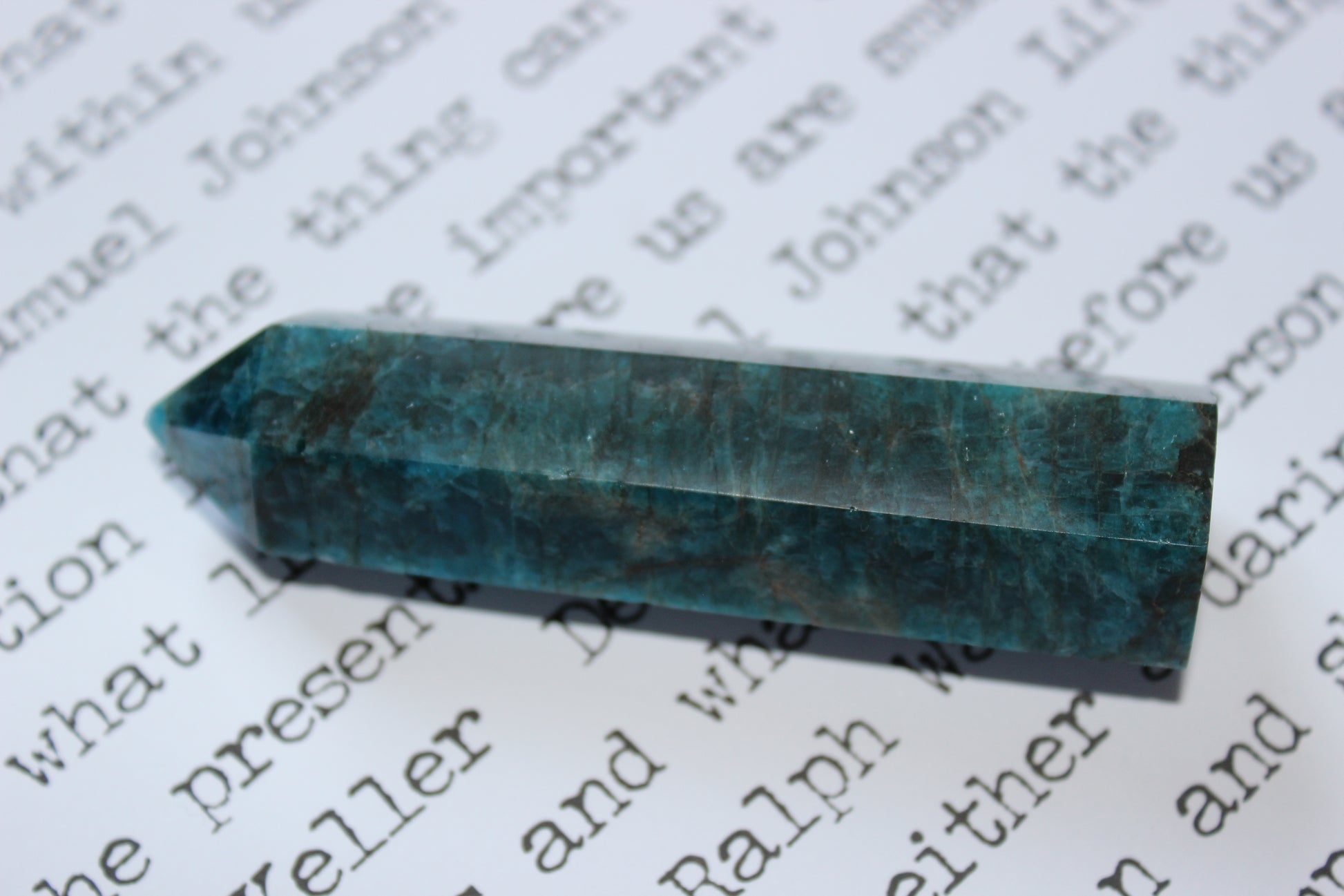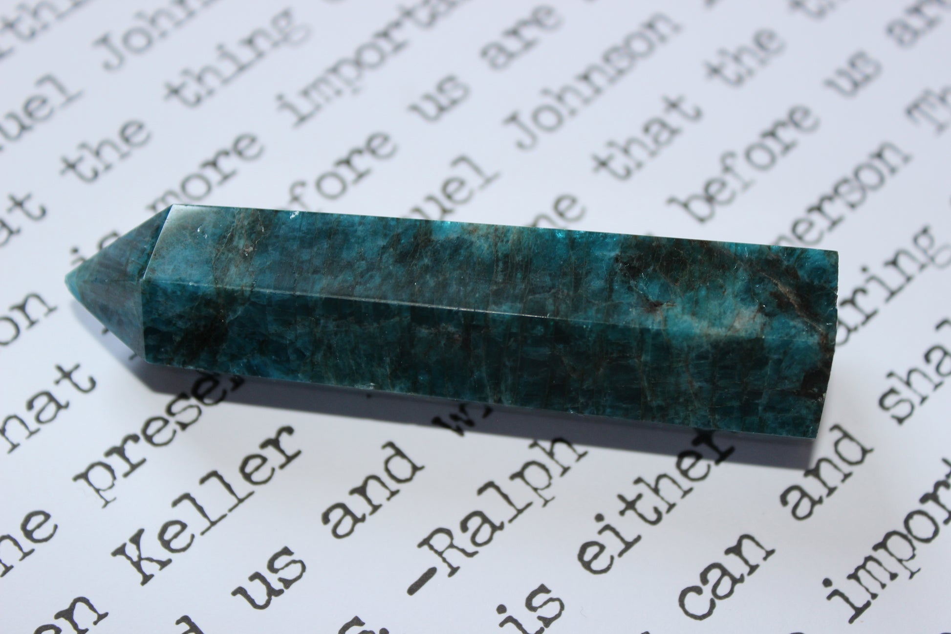 Cut with crystalline precision and cloaked in the hues of ocean ink, this Blue Apatite tower stands like a philosopher's plume—poised, potent, and quietly electric. Its shifting shades mirror well-worn margins filled with luminous musings and errant sketches of the cosmos.