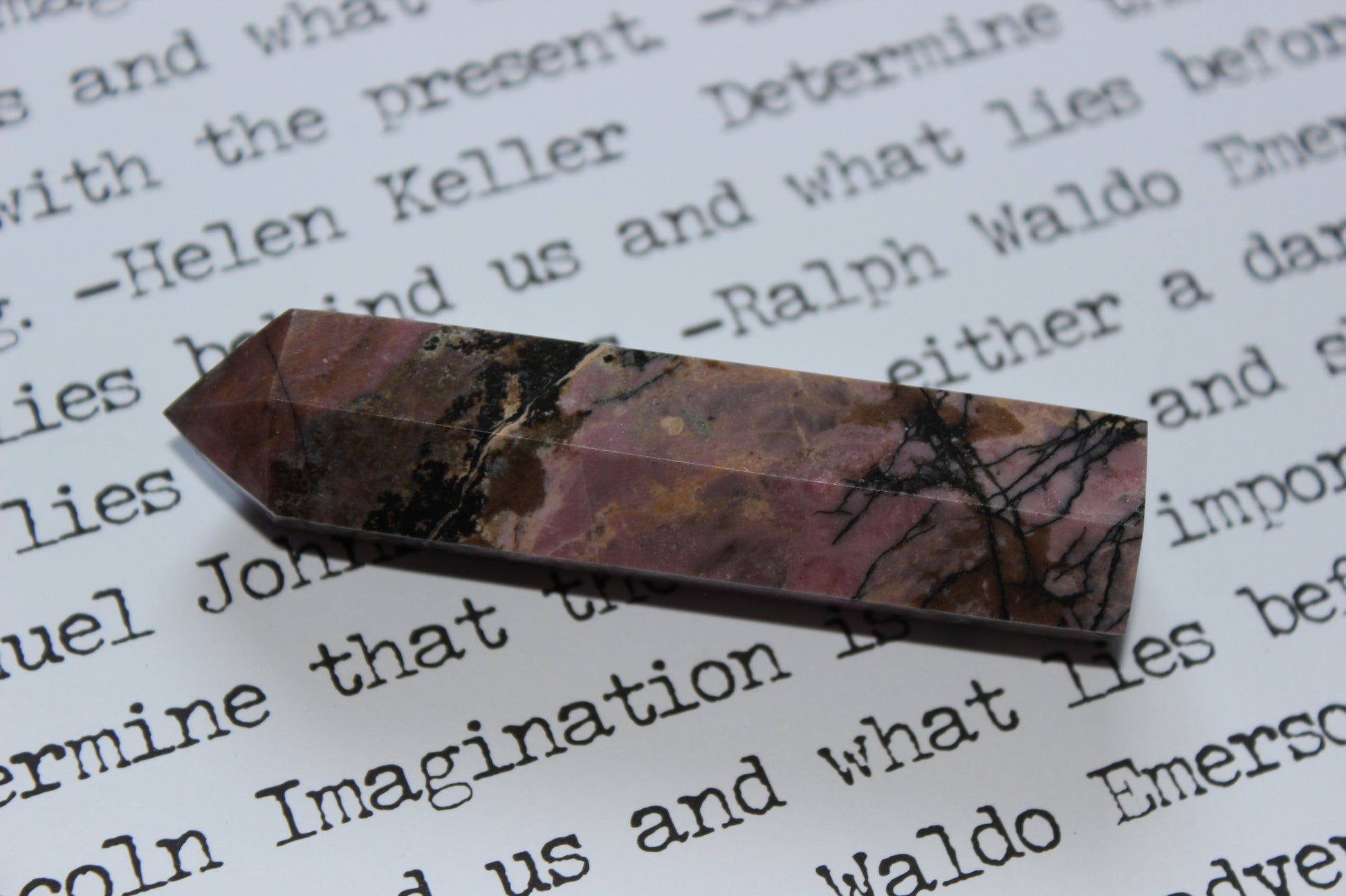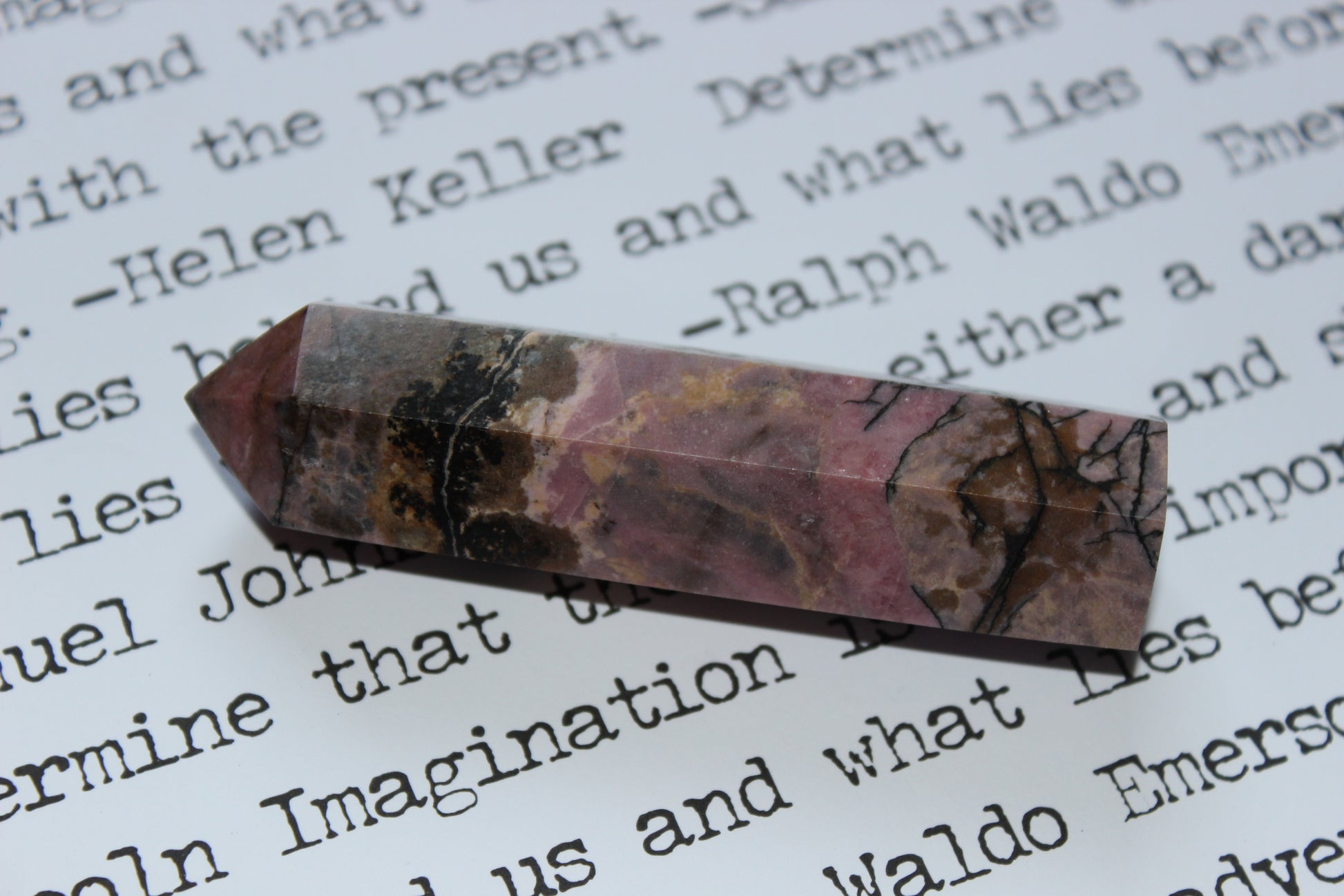 Rosy as pressed petals bound in velvet tomes and marbled with shadows like hand-lettered grief, this Rhodonite tower stands as a testament to healing with courage. Its dark veins wind through blush pink like script across parchment—where pain and compassion meet on the same page.